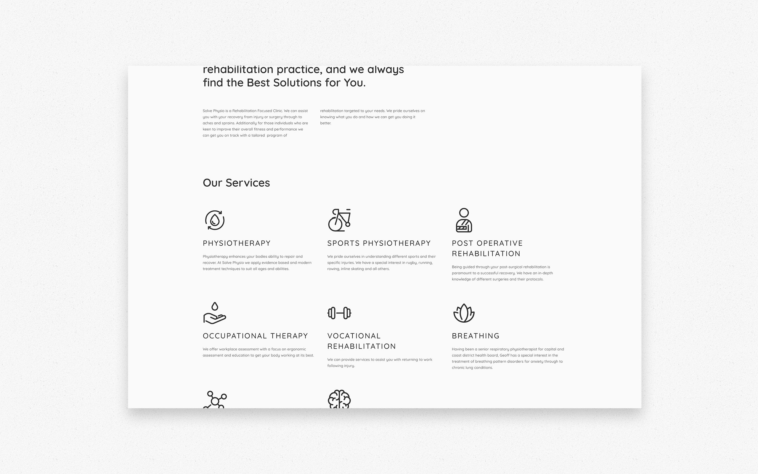 For Solve Physio, we developed a strategic brand foundation and designed a custom website that reflects their professional expertise and client‑centred approach to care. The project combined brand strategy with thoughtful visual design and user experience, resulting in a clean, approachable digital presence that clearly communicates services, builds trust, and supports long‑term growth.
